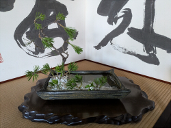 「景色いけ」とは、水の循環により綿々と続いている大自然の生態系の特徴的な景色をいけばなで表現するものです。 深山、森林、野辺、地水、沼沢、河川、海浜で七景となります。 渓谷、渓流から始まる七景の最後、深い山からたどり着いた海、波打ち際は、白砂青松の向こうに大海を望む景色です。