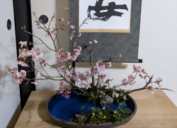 彼岸桜、ツツジ、小菊、シャガ、小石 鎌倉時代に後嵯峨上皇が吉野の桜を嵐山に移植されて、後の世、嵐山は桜の名所となりました。 愛宕山のふもとを岩肌に打ち付けて流れる保津川の清流と川を隔てた対岸に咲き誇る桜とで保津川の美しい景色をいけ表したのが嵐峡の景です。 この「嵐峡の景」と、大沢の池の様子を表した「庭湖の景」、三尾の紅葉を表した「高雄の景」とで景色いけの三勝の景と呼ばれます。 今回は彼岸桜でいけました。