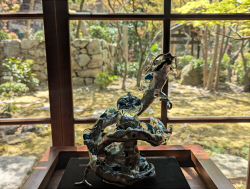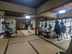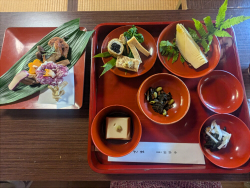 場所は岡山市中区門田屋敷の臨済宗妙心寺派の松琴寺さまです。無柳一参禅師が創建された禅寺で、境内には池田治政公が分祀した児島の瑜伽大権現があります。精進料理で有名なお寺でもあり予約もなかなか取れないらしいのですが、第一教区婦人会の担当寺の景福寺さまが、岡山市仏教会での繋がりがあり、こちらでの総会と昼食会を手配してくださいました。海徳寺でも精進料理を出しておりますので、お料理の一品一品がとても興味深く、美味しくいただきました。特にこちらの名物ともいえる椿の花の天ぷらは姿美しく、感心しました。境内のたくさんの椿を天ぷらにしてみて、一番発色よく揚がるものを数本選んでいるということでした。また、この日は作家の細見博子さんと川埜龍三さんの二人展「龗の宴(おかみのうたげ)」の期間中で、お寺の敷地内にはたくさんの作品が並んでいて目を楽しませてくれて芸術とお料理を堪能しました。