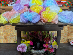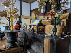 4月の行事には「花まつり」があります。ペーパーフラワーで屋根を飾り付け、誕生佛さまの回りは、生花を並べて、花見堂を作りました。甘茶は今年も奈良県吉野の曹洞宗興大寺さまから吉野で作られたものが届きました。市販のものに比べとても味の濃い甘茶です。誕生仏さまに甘露の雨を注ぎ、お祝いの法要を行いました。