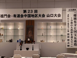 7月もたくさんの行事がありました。上旬には山口市で、祖門会・有道会中国大会山口大会が開催されました。山口市は2024年にニューヨークタイムズが発表した「世界の行くべき52ケ所」で、北米、パリに次ぐ3番目に選ばれた人気観光地です。その山口市観光の上位に必ず名が上がる、曹洞宗瑠璃光寺のご住職が、記念講演として「瑠璃光寺と国宝五重塔~令和の大改修を迎えて」と題してお話をされました。