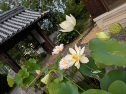 また、蓮も去年はあまり咲かなかったのですが、今年は次々に咲いて毎朝目を楽しませてもらいました。6月下旬から咲き始め、黄玉杯、金鳳展翅(きんぽうてんし)の黄色かかった白蓮、小型種の粉松球蓮、赤色の紅娃蓮、大賀蓮、八重咲きの仏座蓮、印度、白一重と、実に8種類もの蓮が咲きました。7月中旬が花のピークでしたが、まだ花芽をつけていて、8月まで咲いてくれそうで嬉しいです。