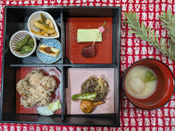 ◆お福豆茶飯 ◆白菜漬け ◆蕪の白味噌仕立て ◆クワイの素揚げ ◆天ぷら(モズク、シシトウ) ◆山ウド醤油漬け ◆割り大根の煮物 ◆焼きネギ(禅味噌) ◆淡雪 ◆リンゴの赤ワイン煮