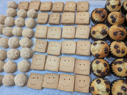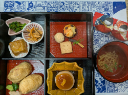◆梅シソ稲荷寿司 ◆きゅうり山葵漬け、甘酢生姜 ◆干しえのき茸とセリのお吸い物 ◆ふろふき大根(ゆず味噌) ◆高野豆腐の揚げ煮 ◆切干大根のハリハリ漬け ◆ブロッコリーの菜花辛子和え ◆焼き菓子3種 (きな粉スノーボール、ショートブレッド、バナナマフィン) オレンジチョコピール